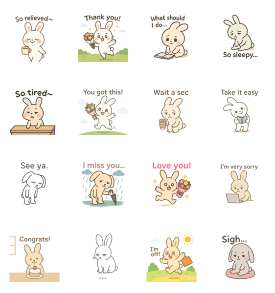 | スタンプ説明 | Meet Bittersweet Bunny, a cute little rabbit with a mix of charm and moody vibes. Perfect for sharing everyday ups and downs with a touch of warmth. |