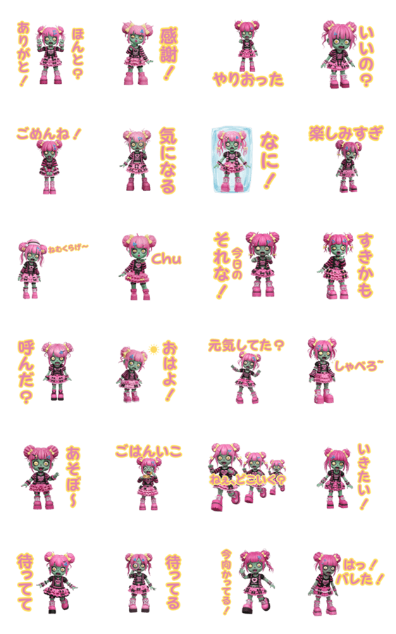 原宿テイストのピンクなゾンビが、日常の「おはよ」「ありがと」「ごめんね」までキュートに彩る。シンプルで使いやすい言葉多め。毎日のトークを原宿ゾンビ色にどうぞ⭐︎