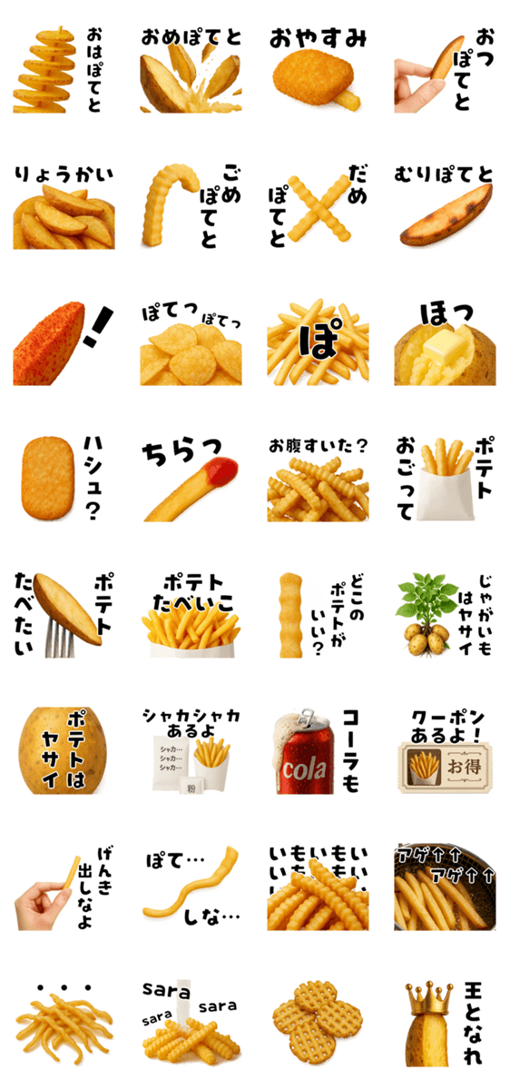 フライドポテト、ポテトチップス、じゃがバターのじゃがいも系全般スタンプです!ポテトって中毒性あるよね?友達を連れポテトに誘うのに便利!