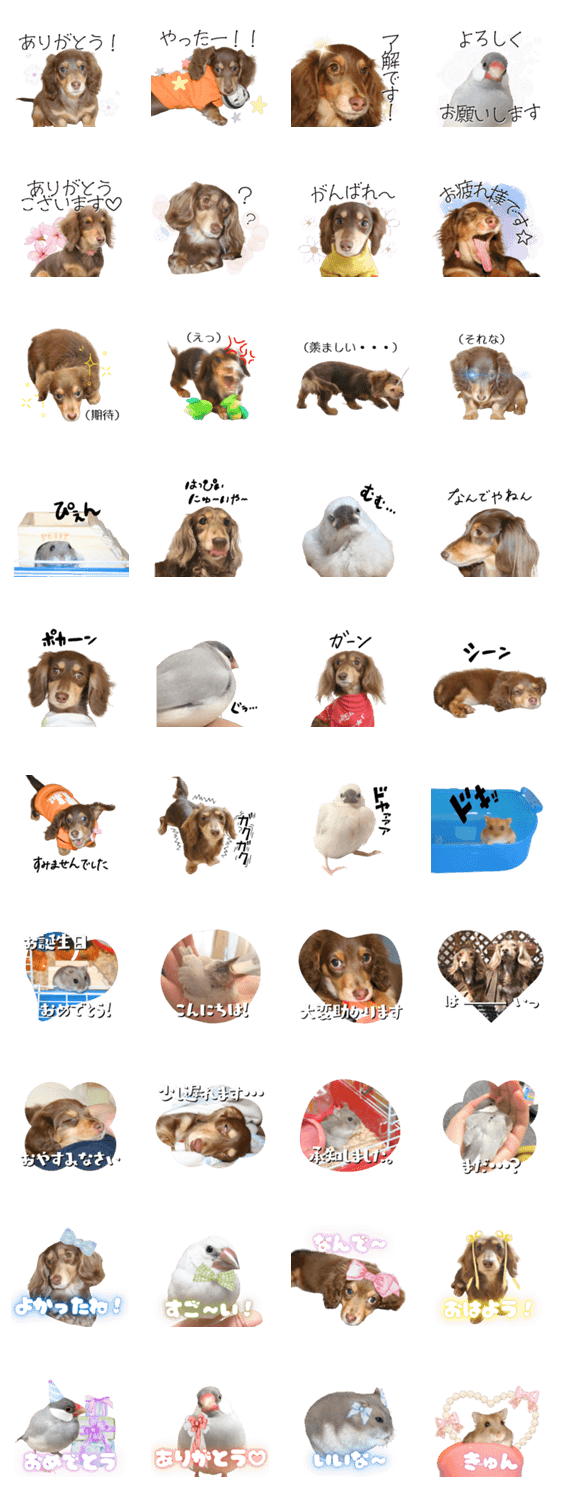 | スタンプ説明 | ミニチュアダックスフンド 「さくら」「はな」。ジャンガリアンハムスター「アクア」。文鳥「ぴこ」。 |