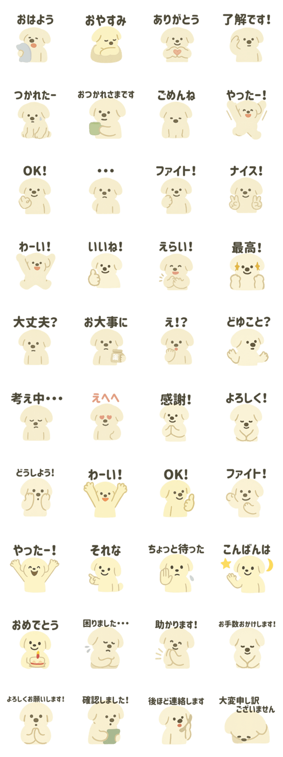| スタンプ説明 | ふわもこ犬が気持ちをやさしく代弁♪ 毎日の挨拶から気持ち表現まで、使いやすいLINEスタンプです。 |