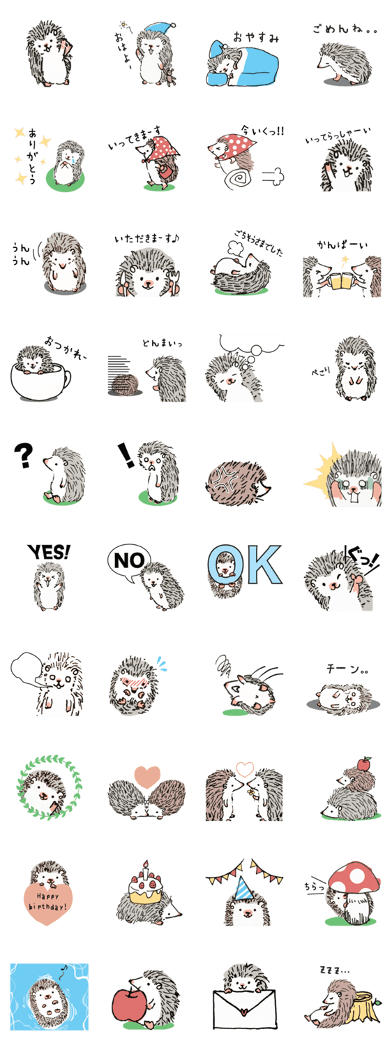使いやすい日常会話をはりねずみたちのステッカーにしました。はりねずみ愛に溢れた手描きイラストです。