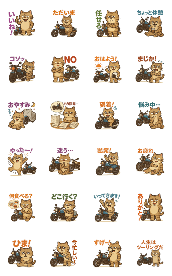 | スタンプ説明 | 「猫なのにおっさん、しかもライダー。その名はまんぞう。愛車エリミネーターにまたがり、笑ったり悩んだりサボったり。ツーリング人生があなたの日常に寄り添います。」 |