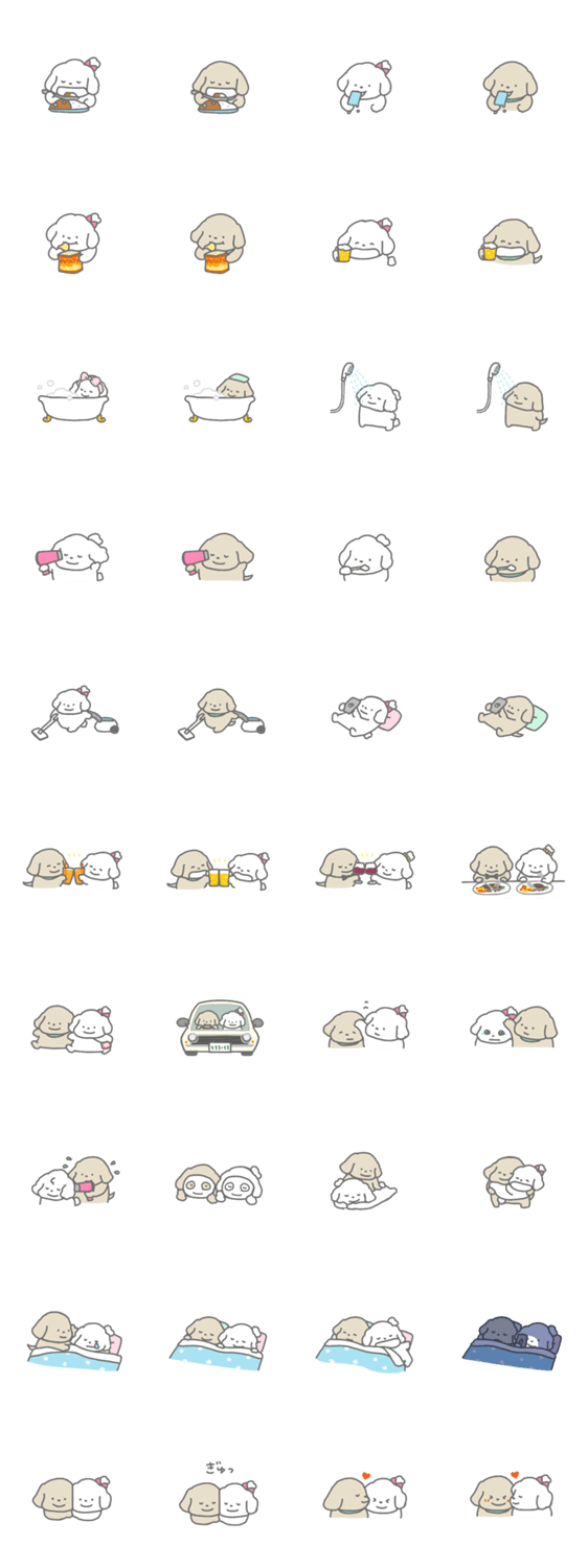 | スタンプ説明 | しろいぬちゃん&ちゃいぬくんの日常をスタンプにしてみました。文字無しなので使いやすさばつぐんです♪(恋人/彼氏/彼女/妻/夫/イヌ/犬/ゆるい/生活/もじなし) |