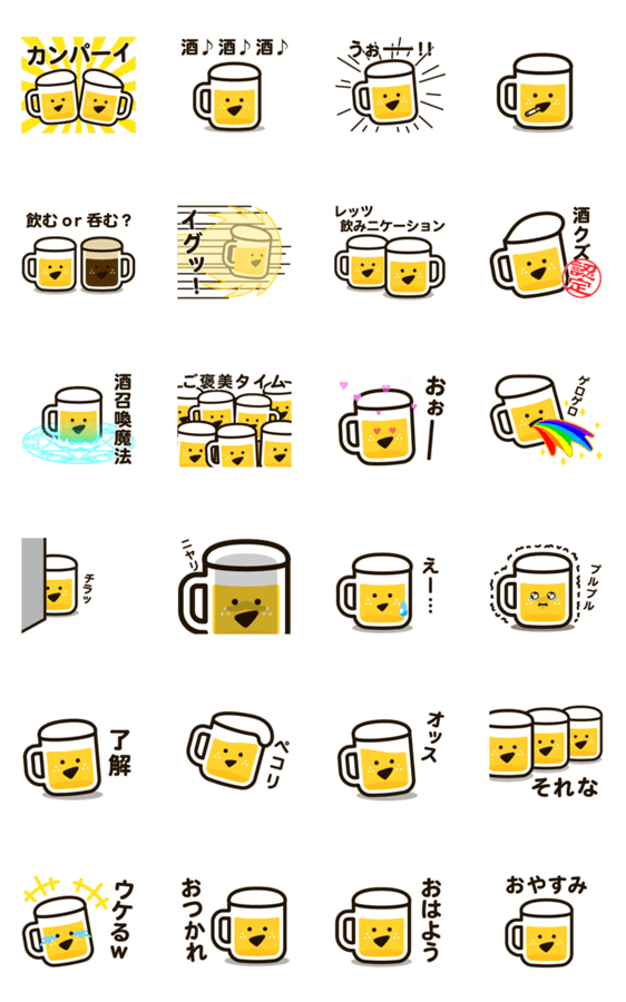 ゆるくてかわいいビールが動きます!お酒は二十歳になってから...でもこれはスタンプなので未成年でも使えます。