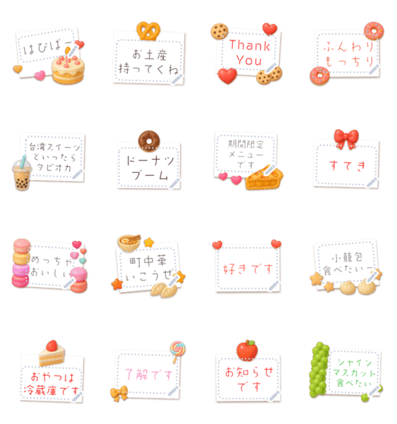 ぷっくり可愛いシールみたいな誕生日ケーキなどのメッセージスタンプ♪文章を書き込めるのでお祝いや普段づかいに♪スイーツ/生成AI/ラーメン/小籠包/餃子/ドーナツ/ハート 現在この商品は一部のスマートフォン版LINE 10.3.0以上のトークルームでのみ使用できます。動作環境の最新情報はヘルプをご確認ください。