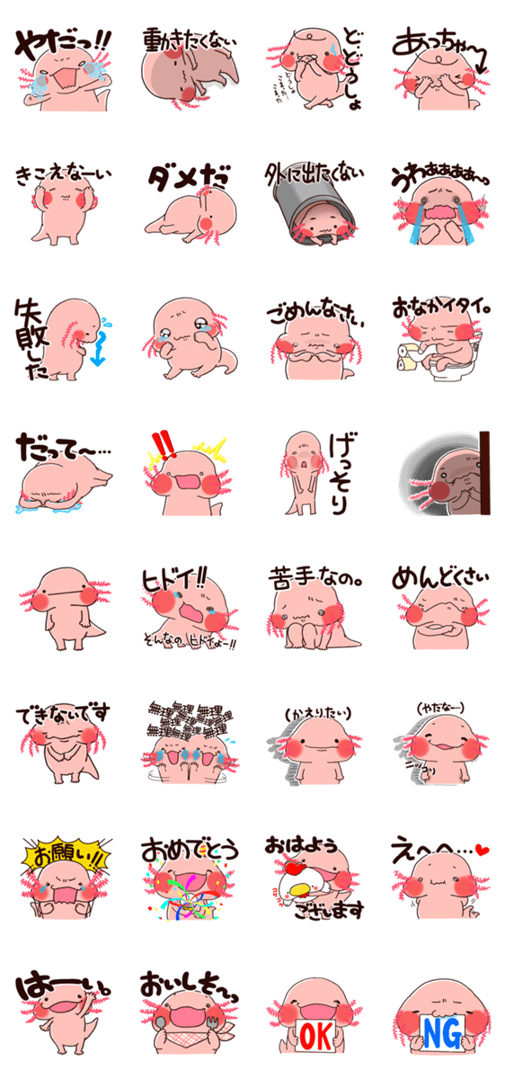 もちっとしたほっぺたの 可愛いウーパールーパーが ちょっとネガティブなスタンプ