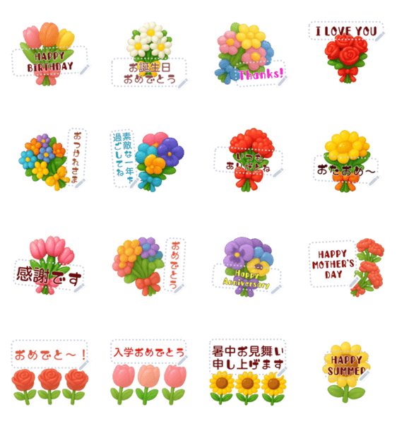 文章や名前などを自由に書き込める♪誕生日や記念日のお祝いに送れます♥ぷっくりかわいい花束のメッセージスタンプ♡バラ/植物/母の日カーネーション/夏のひまわり/生成AI 現在この商品は一部のスマートフォン版LINE 10.3.0以上のトークルームでのみ使用できます。動作環境の最新情報はヘルプをご確認ください。