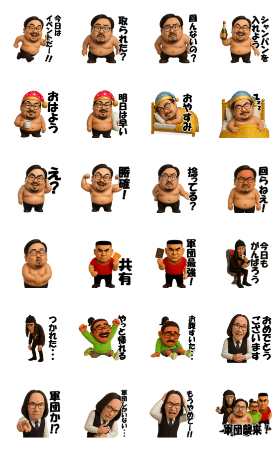 | スタンプ説明 | 軍団の親・幹部・打ち子、そしてクセ強店長が3Dで降臨! 軍団と店長がさらに暴れまくり!? 日常会話でも使える全24個のスタンプ! |
