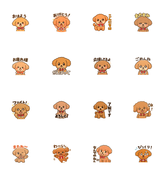 愛犬トイプードルをキャラ化した、かわいいLINEスタンプです。 おはよう、ありがとう、よろしく!など、毎日使いやすい16種類を収録。友達や家族とのトークにぜひどうぞ。