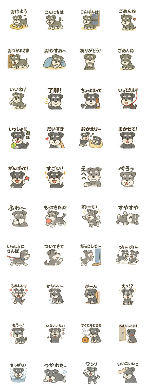 愛くるしいミニチュアシュナウザーの手描きカラー40種。挨拶・感情・遊び・お散歩など、日常の会話にぴったり!