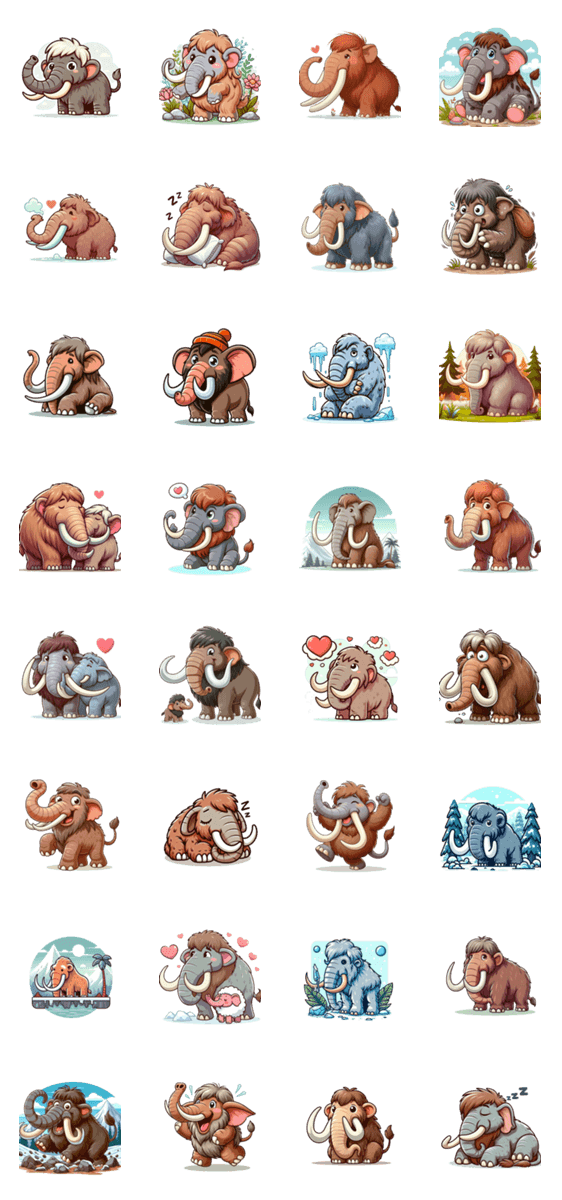 キュートなマンモスのカートゥーンスタンプで会話をもっと楽しく!表情豊かで魅力いっぱい、毎日友達と笑顔や気持ちをシェアできます。