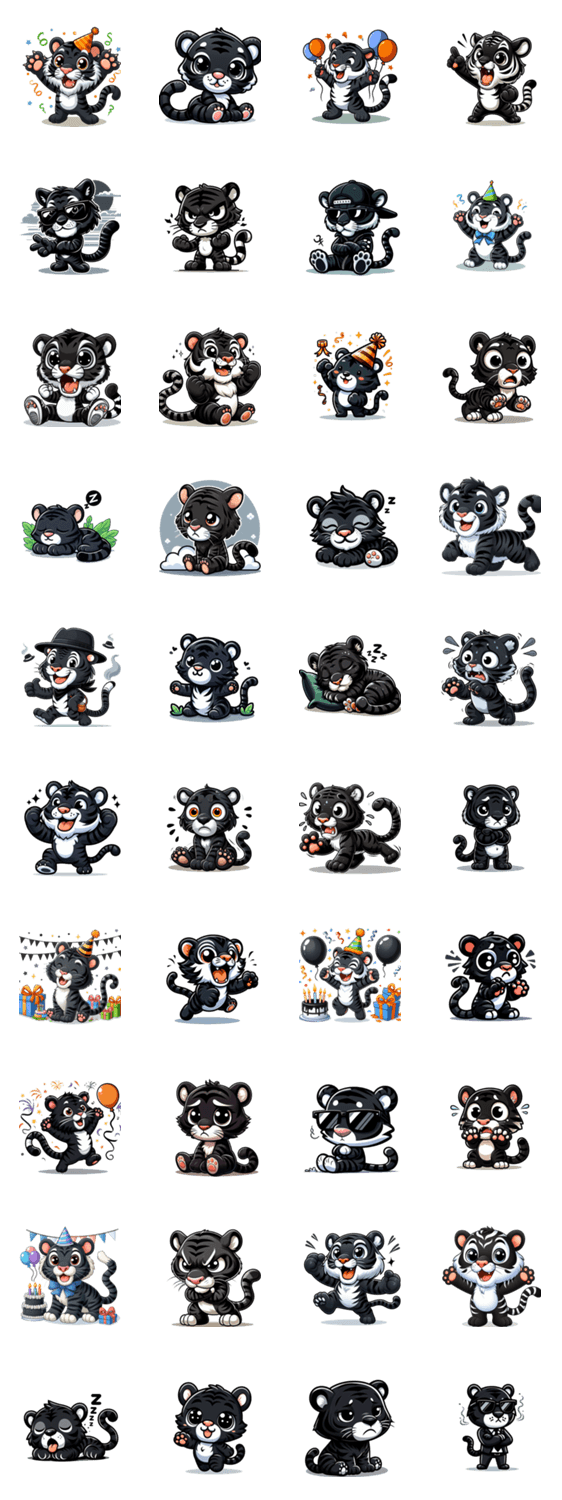 強さとかわいさを兼ね備えたブラックタイガースタンプ!感情表現や応援にぴったりで、チャットに楽しさと個性をプラスします。
