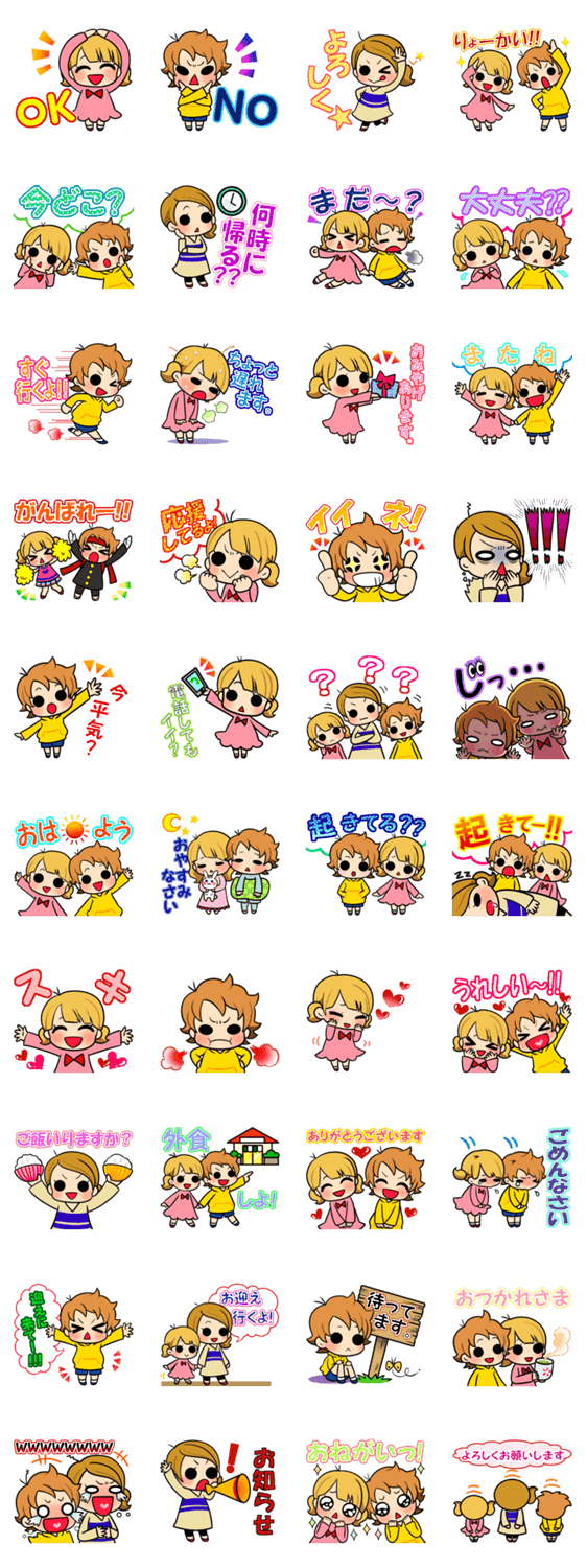 家族向けスタンプ。パパママ、おこちゃま、じじばば、ママ友にも。可愛い双子ちゃんとママのスタンプを送って会話を盛り上げてネ!