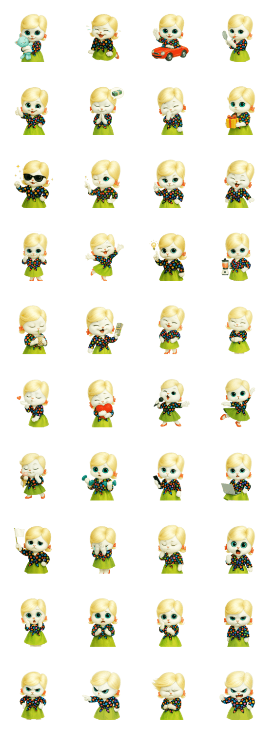 | スタンプ説明 | ヴィンテージの水玉ドレスと明るいブロンドのブーファンヘアスタイルをした可愛い猫、レトロな猫、可愛い動物スタンプ |