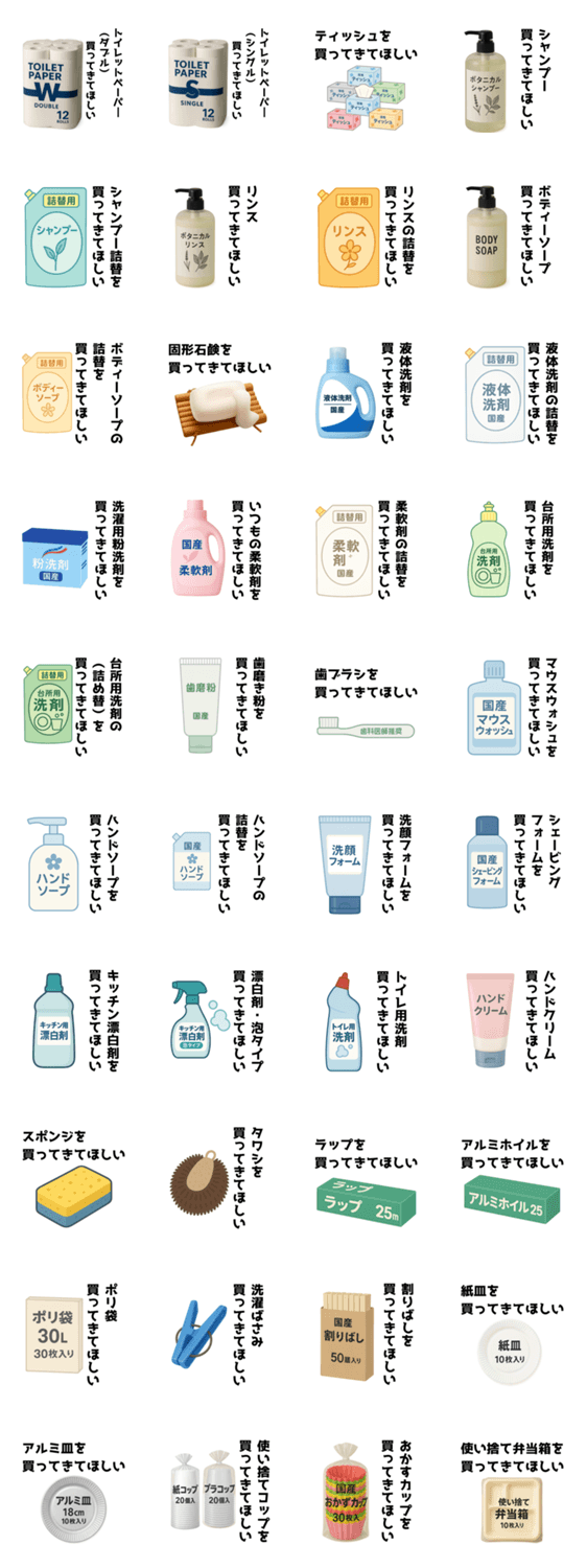 | スタンプ説明 | 子供のお使いや高齢の方で文字入力が苦手な方でも安心。かわいいイラストをタップするだけで、買い物のお願いが簡単にできます。家族や友人との日常に便利 |