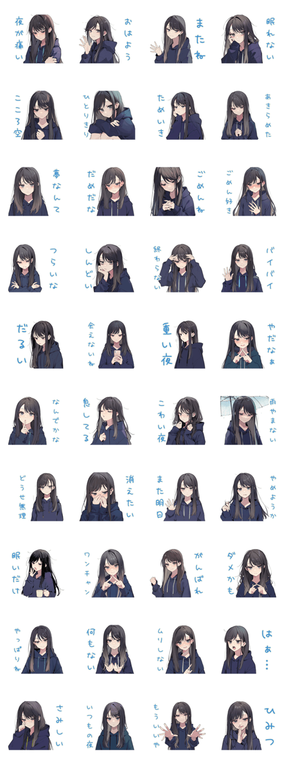 ネガティブや暗い気分にぴったり。陰キャ女子のイラストで普段使いできるスタンプです。寂しい/共感/夜