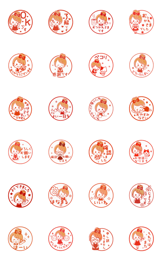 ふんわりおだんごヘアの女の子が、ほっこりハンコ風で登場!日常のちょっとしたやりとりにぴったりなゆるかわスタンプです。