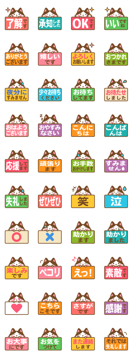 | スタンプ説明 | シャイなハチワレさんがボードからチラッと顔を出す、日常で使えるシンプルな敬語のスタンプです。了解です / おつかれさまです / ありがとうございます など。 |