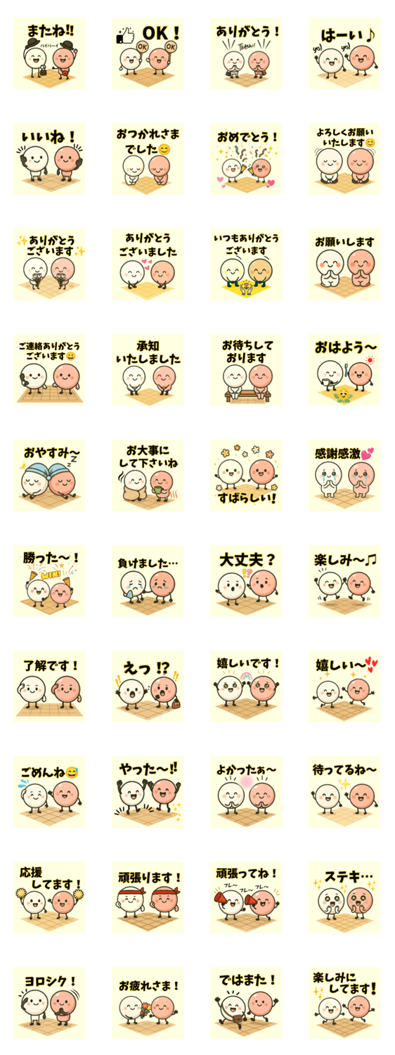 囲碁の碁石をモチーフにしたかわいいキャラクターのスタンプです。“ありがとう” “またね” “OK” など日常会話に使いやすい40種類。囲碁好きさんにもおすすめです。