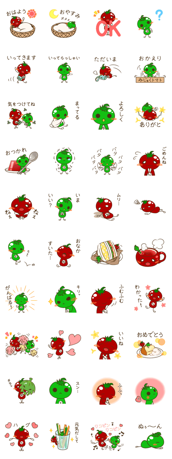 完熟トマトのトマちゃんと未熟トマトのマトくんの日常スタンプです。トークに可愛さと彩りを添えて…!