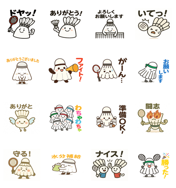 バドミントン大好き!かわいいシャトルくんと仲間たちのスタンプです。試合でも日常会話でも使いやすい、楽しい表情がいっぱい!
