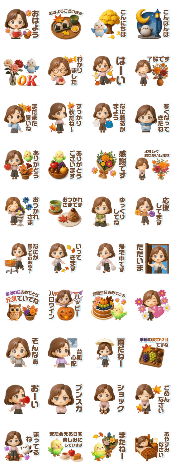 秋冬にずっと使える♡人気の3Dドール風女の子のかわいい日常スタンプ♪挨拶敬語リアクション♪紅葉/スイーツ/敬老の日/ハロウィン/寒い/大人女子/シニア/インコ/シマエナガ