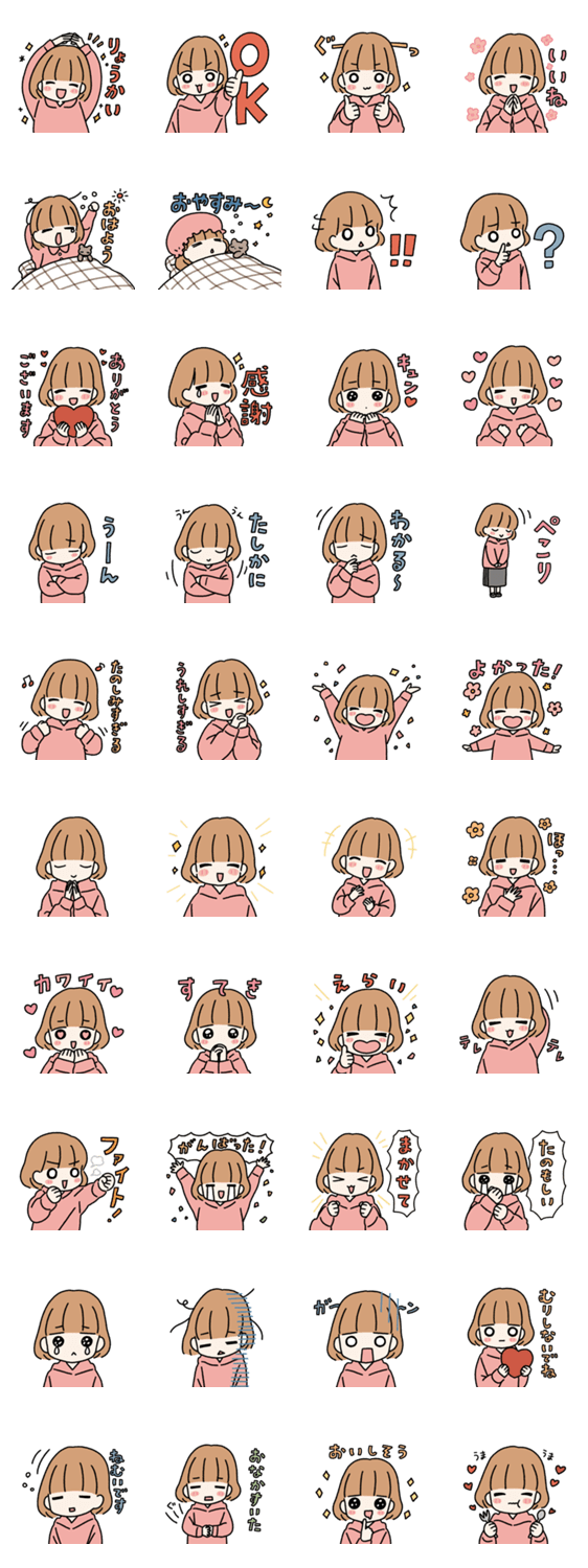 ボブヘアの女の子スタンプです。毎日よく使う言葉を集めました! 日常/ボブヘア/女の子/ほんわか/かわいい/友達/家族/恋人