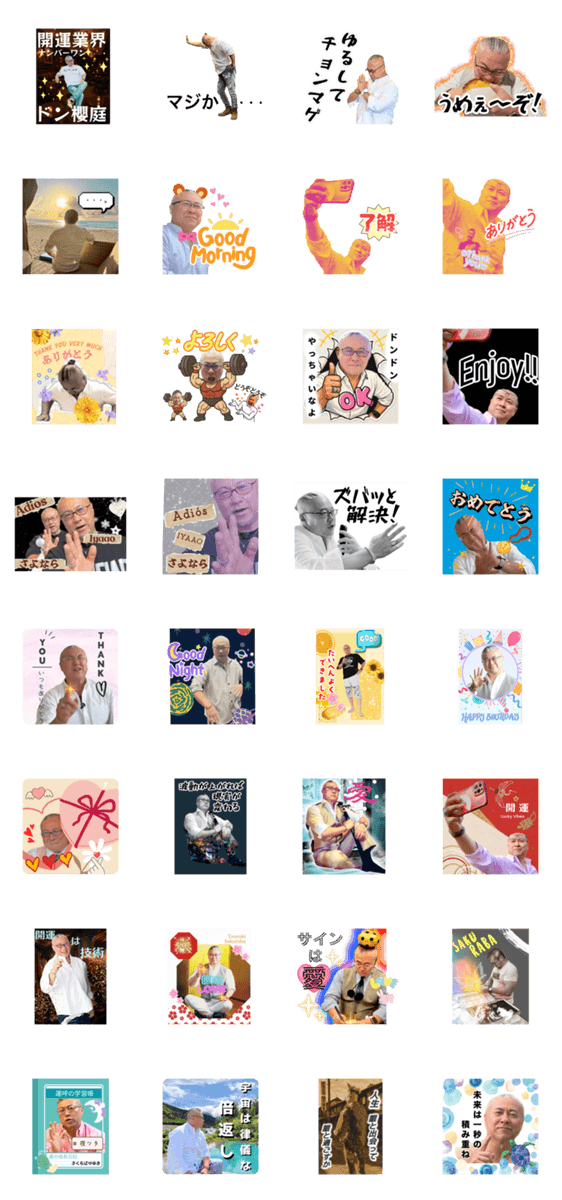 | スタンプ説明 | 開運業界No.1!我らの櫻庭露樹大王スタンプ。奥さん、全捨離してる? |
