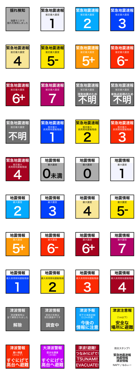 緊急地震速報、地震情報、津波情報のスタンプです。