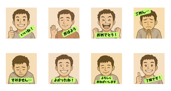 | スタンプ説明 | お父さんが日常生活の中でよく使う言葉をラインスタンプにしてみました。どうぞ使ってみてください。 |