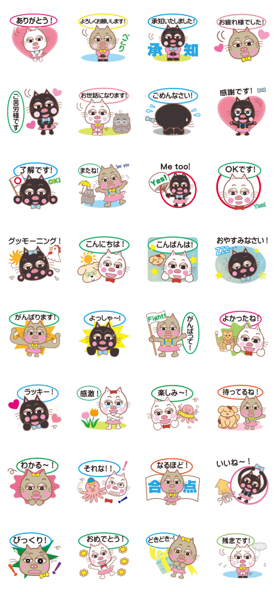 3匹のブタネコちゃん、白、茶々、黒 -LINEスタンプマニア