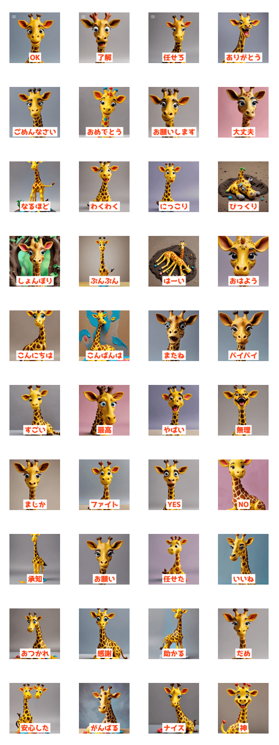 | スタンプ説明 | ゆるかわキリンが毎日の会話をもっと楽しく!挨拶からリアクションまで使いやすい40種類。トークがほんわか盛り上がります。 |