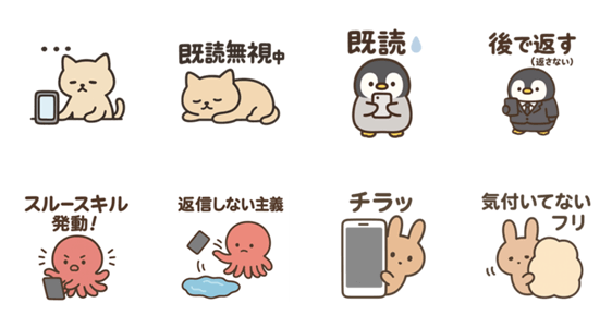 | スタンプ説明 | ネコ、ペンギン、タコ、ウサギが既読無視!かわいくてシュールな動物たちが、日常のスルースキルをスタンプで表現。使えば会話がもっと楽しくなるよ♪ |
