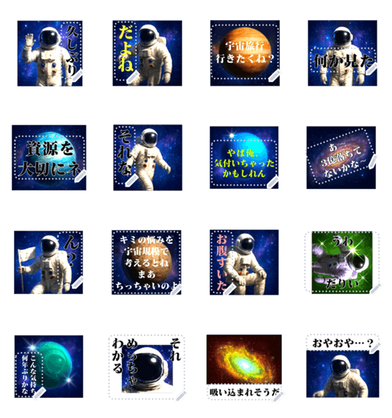自由に文章を書き込める★宇宙飛行士・惑星・銀河・SF映画のような雰囲気の壮大な宇宙空間を感じちっぽけな毎日を面白おかしく彩れちゃうかもなメッセージスタンプです。 現在この商品は一部のスマートフォン版LINE 10.3.0以上のトークルームでのみ使用できます。動作環境の最新情報はヘルプをご確認ください。