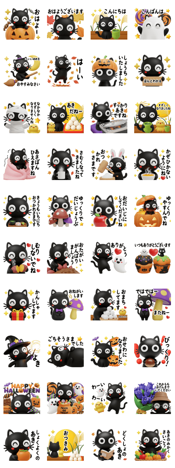 丸い目の真っ黒クロネコシリーズぷっくり可愛い3Dです。秋を楽しむセットです♪黒猫/クロネコ/くろねこ/可愛い/日常挨拶/ねこがすき/秋/敬老の日/ハロウィン/十五夜/お月見