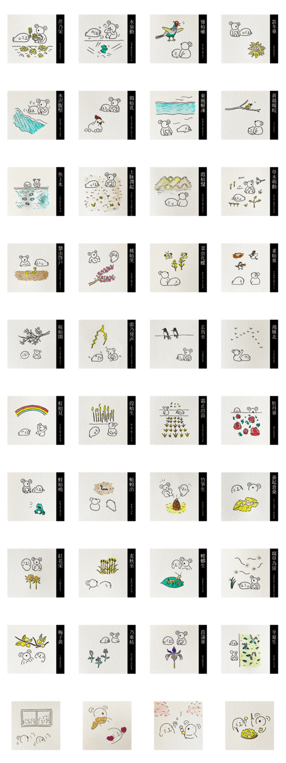 | スタンプ説明 | にちじょうこあらと過ごすゆる~い七十二候のスタンプです。このセットは上半期(小寒~夏至、1月~6月ごろ、新春~初夏あたり)がメインになります。 |