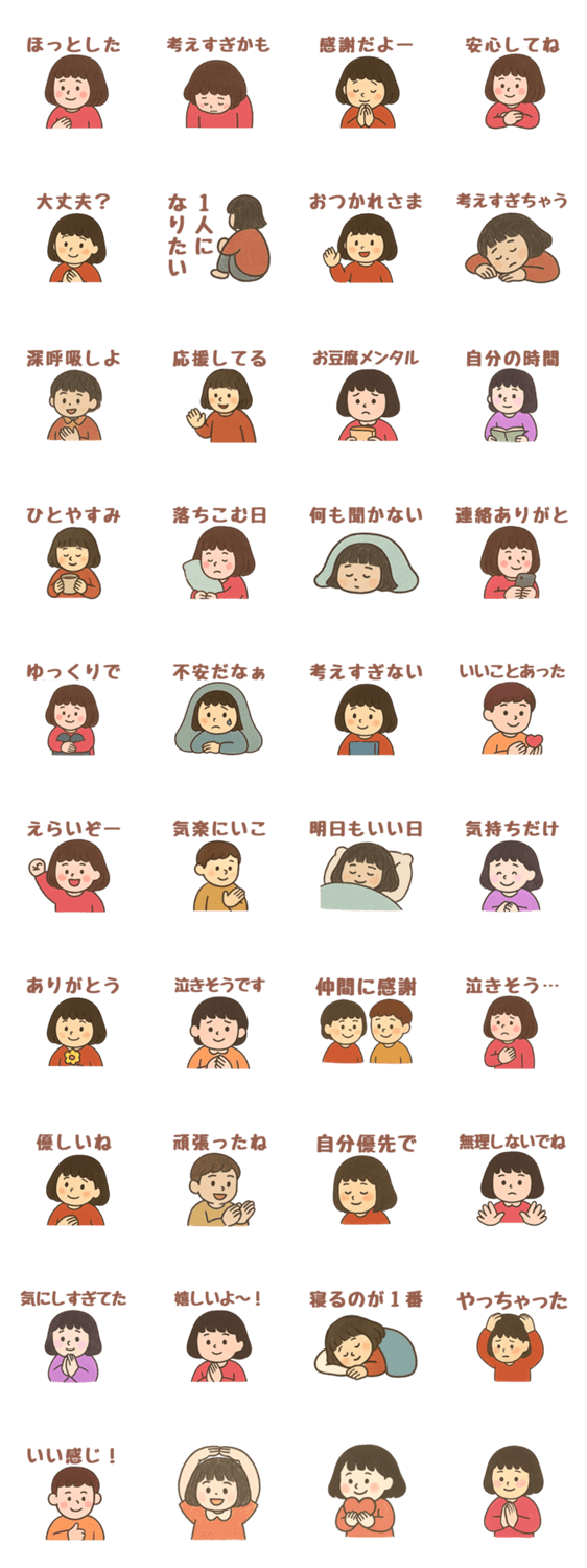 ちょっと落ち込みやすいとき、不安になりやすいときに。 やさしい言葉があふれる癒し系スタンプで、気持ちをやさしく届けます。思いやりスタンプです。