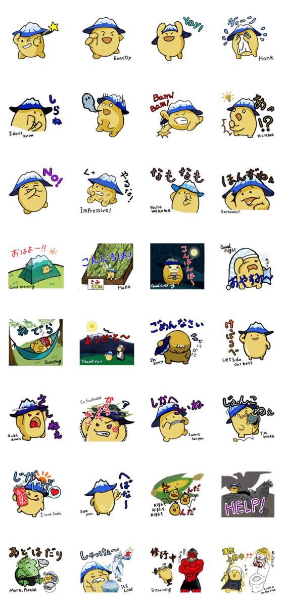 青森県津軽地方の岩木山生まれのトウモロコシ妖怪・岩木さんのスタンプ。妖精になりたいと憧れる岩木さんが、各地の神様や妖怪と出会い成長する様子を描いたスタンプです。