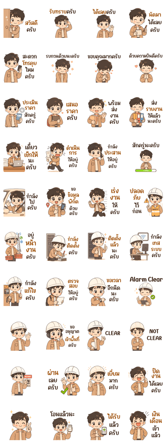 | スタンプ説明 | Polite telecom engineer stickers for daily work - ideal for greetings, coordination, meetings, motivation, and professional office chats. |