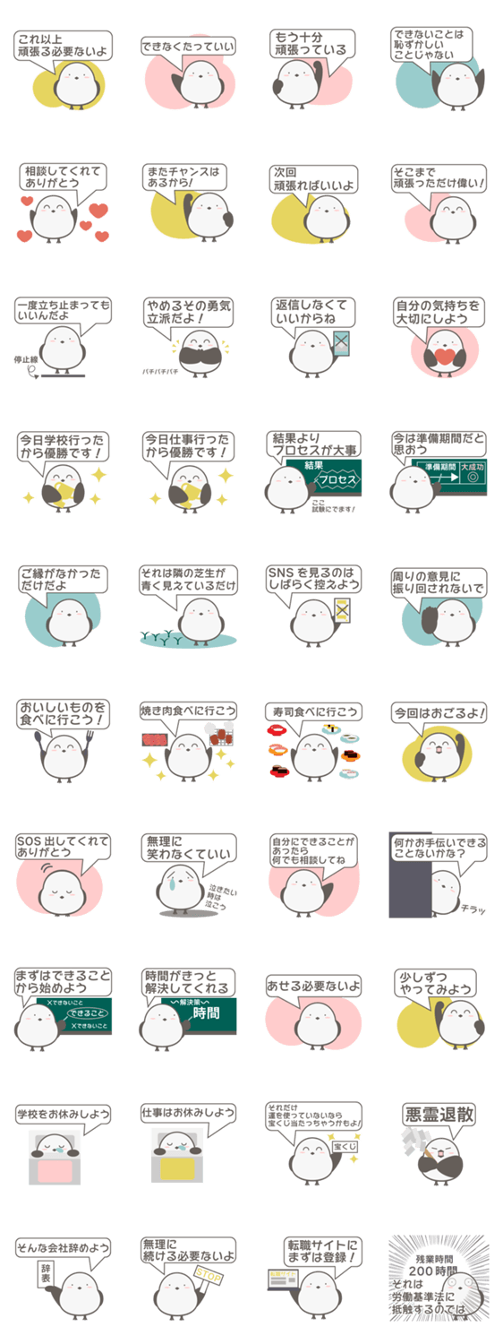 | スタンプ説明 | ココロやカラダが疲れた元気のない友達や家族等に送れる励ましやねぎらいの言葉が詰まったスタンプです。励ます/慰労/労わり/応援/気遣い/可愛い/いたわり/労い/感謝/大人 |