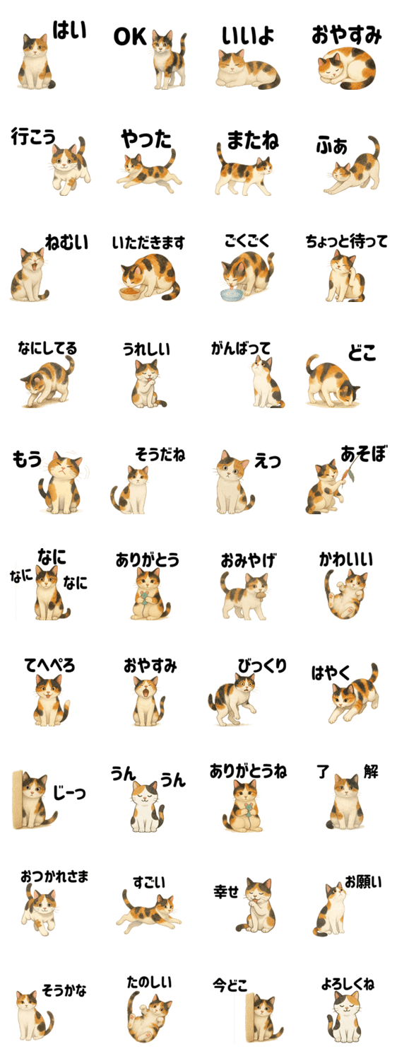 日常会話にぴったりの三毛猫スタンプ!あいさつからリアクションまで、かわいい40種類でトークをもっと楽しく。