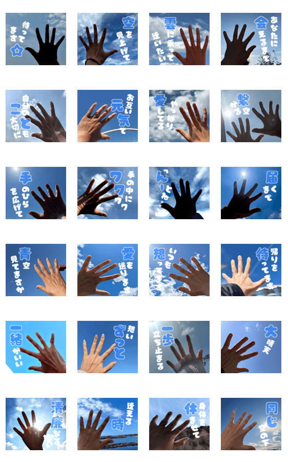 | スタンプ説明 | 青い空に手のひらを。公式LINEスタンプ 第一弾 ~アオソラテノヒラ~ です。手のひらメンバーの 手のひらと、届けたい言葉がスタンプになっています。 |