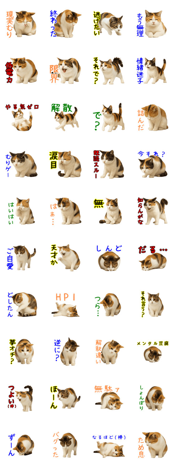 猫 ネコ 三毛猫 のネガティブ系スタンプ。「現実むり」「終わった」「むりゲー」「逃げたい」など本音を可愛く代弁。文字入り/縦書き/シンプルで日常に使いやすい。