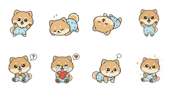 | スタンプ説明 | Naughty Pom! Adorable Chibi stickers of a cute Pomeranian with 8 cheerful poses, wearing a lovely floral PJ! Bring joy to every chat! |