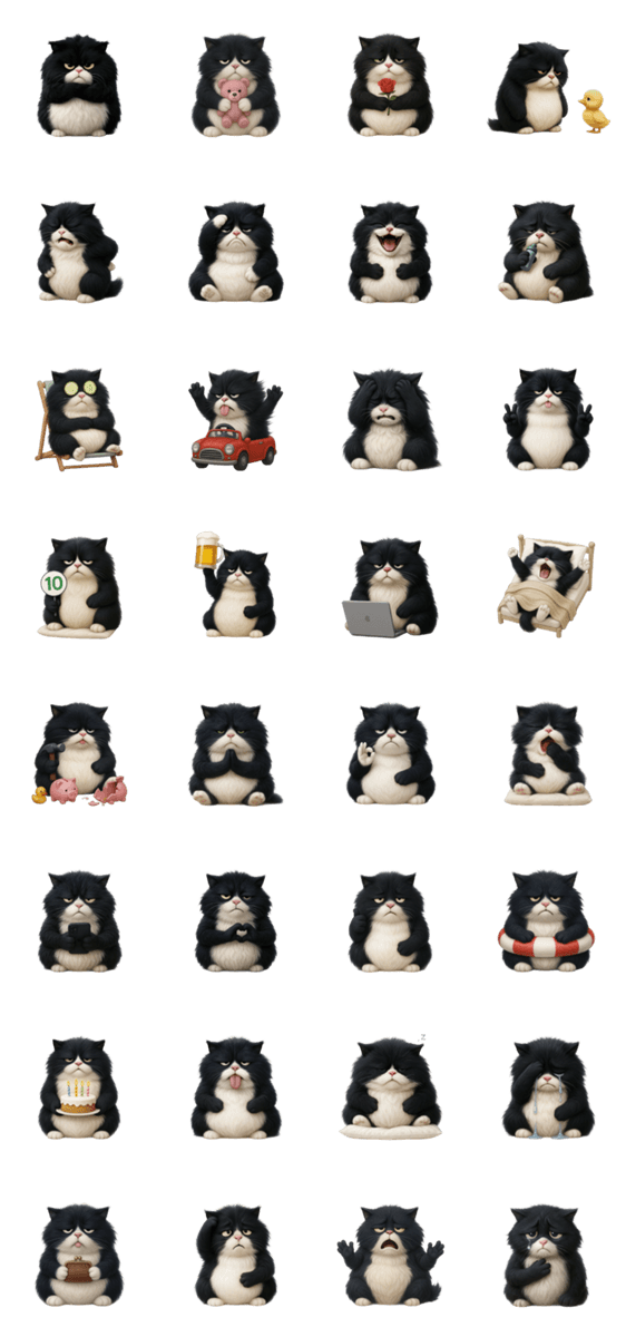 | スタンプ説明 | A black and white cat with fluffy fur and a tight face (No text) |