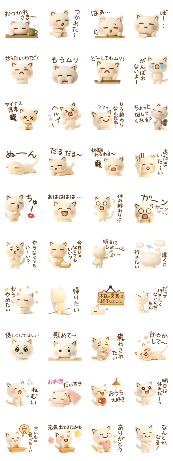 がんばれないときもある。誰かに甘えたかったり、疲れたーって声に出したかったり…。そんな日の気持ちを代弁してくれるぬいぐるみになった猫のスタンプ。無気力/脱力/ネコ