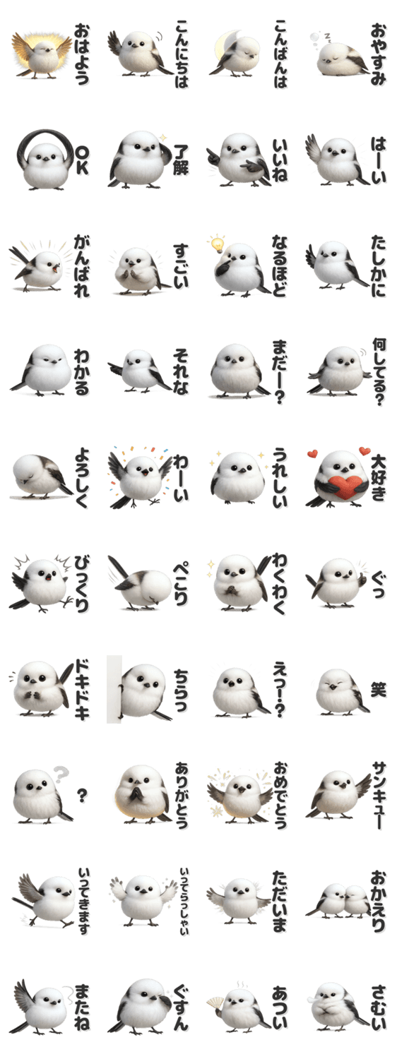 雪玉みたいにかわいいシマエナガのスタンプです。/ゆるい/癒し/日常/動物/友達/挨拶/人気/楽しい/表情/可愛い/