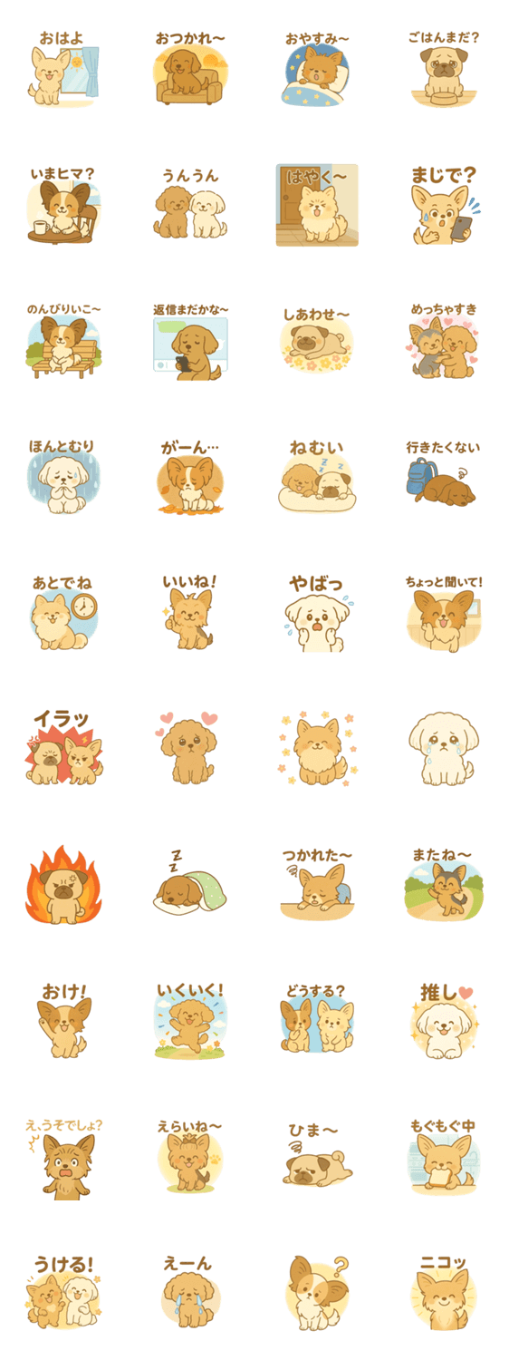 かわいい小型犬たちと一緒に、気軽に送れる挨拶を集めました。 毎日のちょっとした会話にどうぞ! トイプー、チワワ、パグなど人気の小型犬たちが登場!
