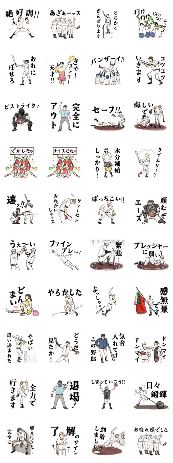 日常の挨拶や応援メッセージをコミカルに伝える野球スタンプ。現役野球部員、元球児、野球ファン必携。甲子園/選抜/スポーツ/部活/チアガール/審判/応援団/体育会系/面白系
